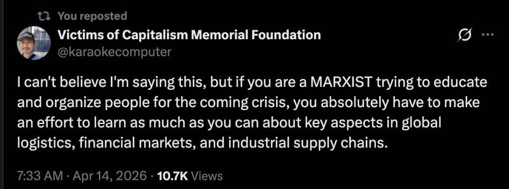 On 14 April, Twitter user ‘Victims of Capitalism Memorial Foundation’, (also known as ‘Mikey’ on various podcast appearances) posted what you see above to their account.
